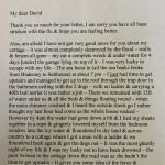 Alas, am afraid I have not got very good news for you about my cottage – it was almost completely destroyed by the flood – walls & fences all gone – my car a complete wreck & under water for 4 days [under] the garage lying on top of it – I was very lucky to escape with my life – The sea burst in (all the sea banks broke from Blakeney to Salthouse) at about 7 pm – I just had time to get upstairs and managed to get up in the roof through the trap door in the bathroom ceiling with the 2 dogs – with no ladder & carrying a 40lb bull terrier it was rather a job – There we remained with 12ft of water under us & all the beds & things floating round – when the main chimney crashed & I heard the outside sheds go I rather thought my last hour had come as the whole house rocked – However by 4am the water had gone down a bit & I tied my sheets together in a rope & gingerly lowered myself from the bedroom window into the icy water & floundered to dry land & across country to a cottage where I got a man with a ladder & we floundered back again & got the dogs out – It was the most ghastly night of my life & I was my lucky not to have been drowned – the poor woman in the cottage down the road was as she hadn’t the time to get upstairs – It gives you some idea of the force & magnitude of the water when I tell you that my kennels, garden shed & hens house were found nearly a mile up the valley at Glandford the next village!! – The devastation at Cley & Salthouse is simply appalling with just the Shells of houses standing & every garden wall knocked flat – Mercifully I was insured for flood so shall get something although nothing like the full value of most of my possessions that were ruined or swept away – most of the poor people round about weren’t insured at all – Thanks to the incredible kindness & hard work of my friends & family we have cleared the house entirely, except for a few hundred books lying in a foot or so of mud – I have been lent an old car too & am really very lucky all round – Lilias is letting me put the remains of my furniture in her cottage over the way, here until I have had time to collect myself & make plans – am rather off houses & the sea at the moment!!