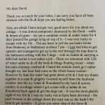 Alas, am afraid I have not got very good news for you about my cottage – it was almost completely destroyed by the flood – walls & fences all gone – my car a complete wreck & under water for 4 days [under] the garage lying on top of it – I was very lucky to escape with my life – The sea burst in (all the sea banks broke from Blakeney to Salthouse) at about 7 pm – I just had time to get upstairs and managed to get up in the roof through the trap door in the bathroom ceiling with the 2 dogs – with no ladder & carrying a 40lb bull terrier it was rather a job – There we remained with 12ft of water under us & all the beds & things floating round – when the main chimney crashed & I heard the outside sheds go I rather thought my last hour had come as the whole house rocked – However by 4am the water had gone down a bit & I tied my sheets together in a rope & gingerly lowered myself from the bedroom window into the icy water & floundered to dry land & across country to a cottage where I got a man with a ladder & we floundered back again & got the dogs out – It was the most ghastly night of my life & I was my lucky not to have been drowned – the poor woman in the cottage down the road was as she hadn’t the time to get upstairs – It gives you some idea of the force & magnitude of the water when I tell you that my kennels, garden shed & hens house were found nearly a mile up the valley at Glandford the next village!! – The devastation at Cley & Salthouse is simply appalling with just the Shells of houses standing & every garden wall knocked flat – Mercifully I was insured for flood so shall get something although nothing like the full value of most of my possessions that were ruined or swept away – most of the poor people round about weren’t insured at all – Thanks to the incredible kindness & hard work of my friends & family we have cleared the house entirely, except for a few hundred books lying in a foot or so of mud – I have been lent an old car too & am really very lucky all round – Lilias is letting me put the remains of my furniture in her cottage over the way, here until I have had time to collect myself & make plans – am rather off houses & the sea at the moment!!